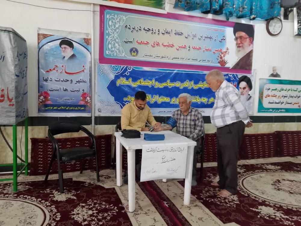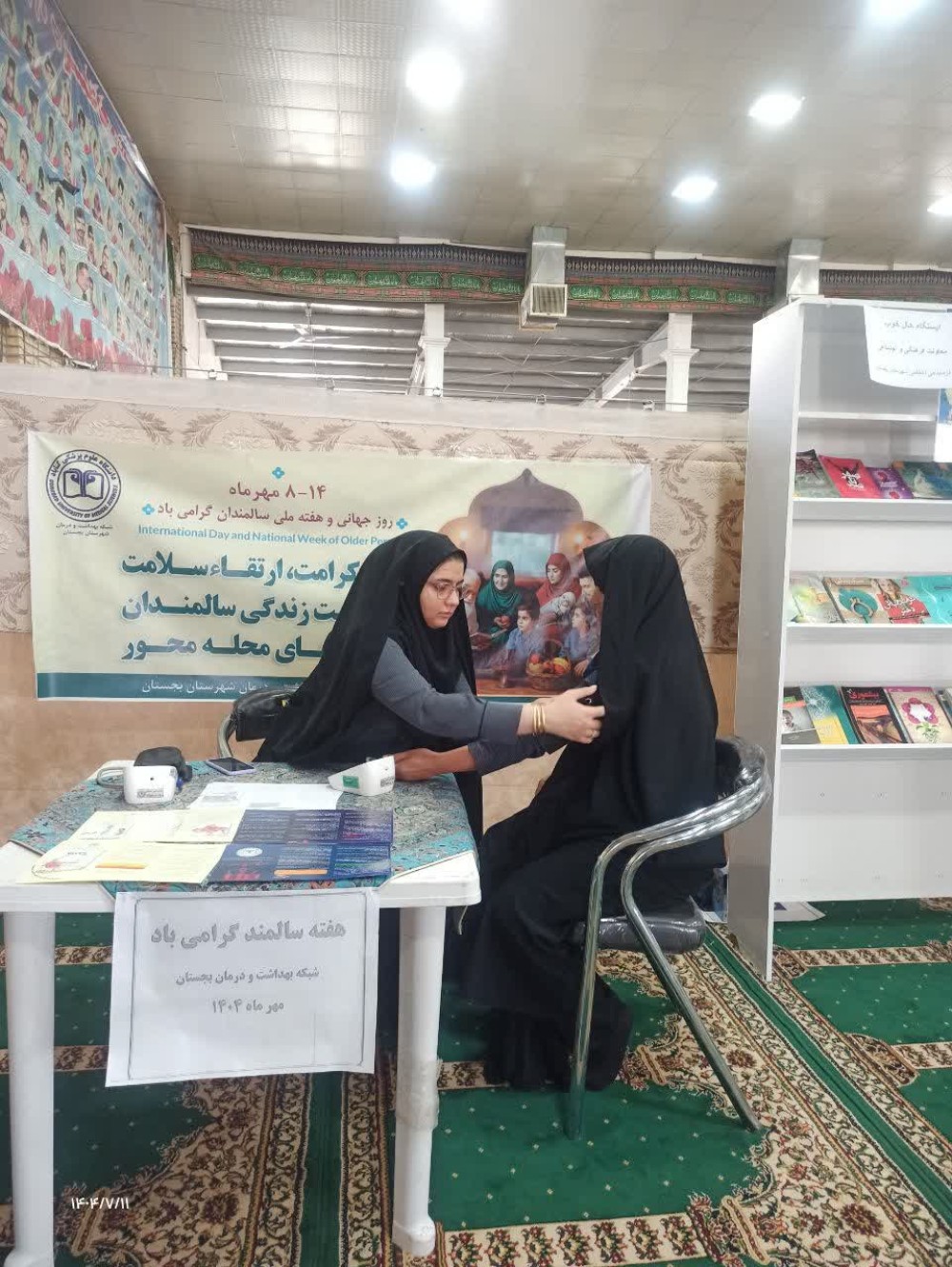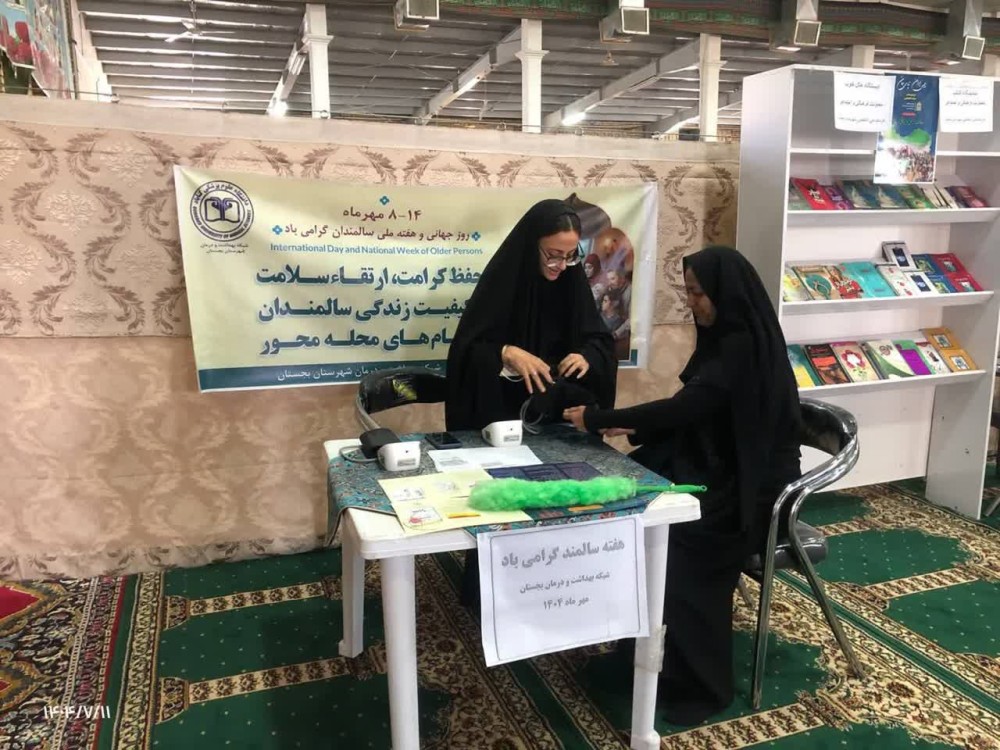 در مراسم عبادی سیاسی نماز جمعه ۱۱ مهرماه و به مناسبت «هفته ملی سالمند» شبکه بهداشت و درمان شهرستان بجستان با برپایی میز خدمت و ایستگاه سلامت در مصلی امام خمینی (ره) بجستان و هیئت فاطمیه شهر یونسی، خدمات سلامت شامل: توزیع مطالب آموزشی، ارائه مشاوره های بهداشتی و درمانی، سنجش فشار خون و قند خون، تن سنجی و ... را برای نمازگزاران آقا و خانم ارائه نمود
